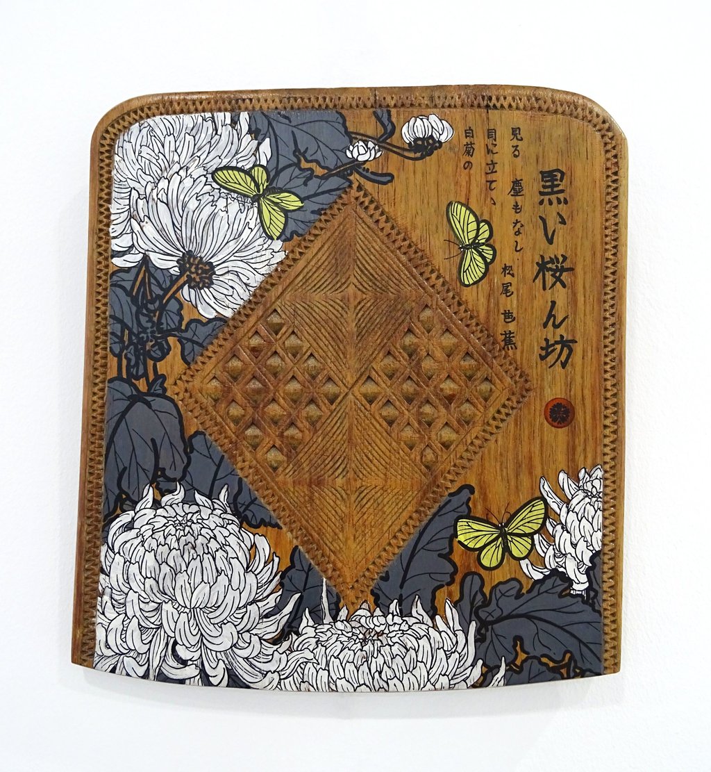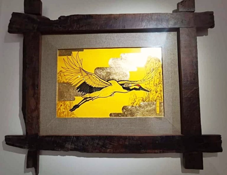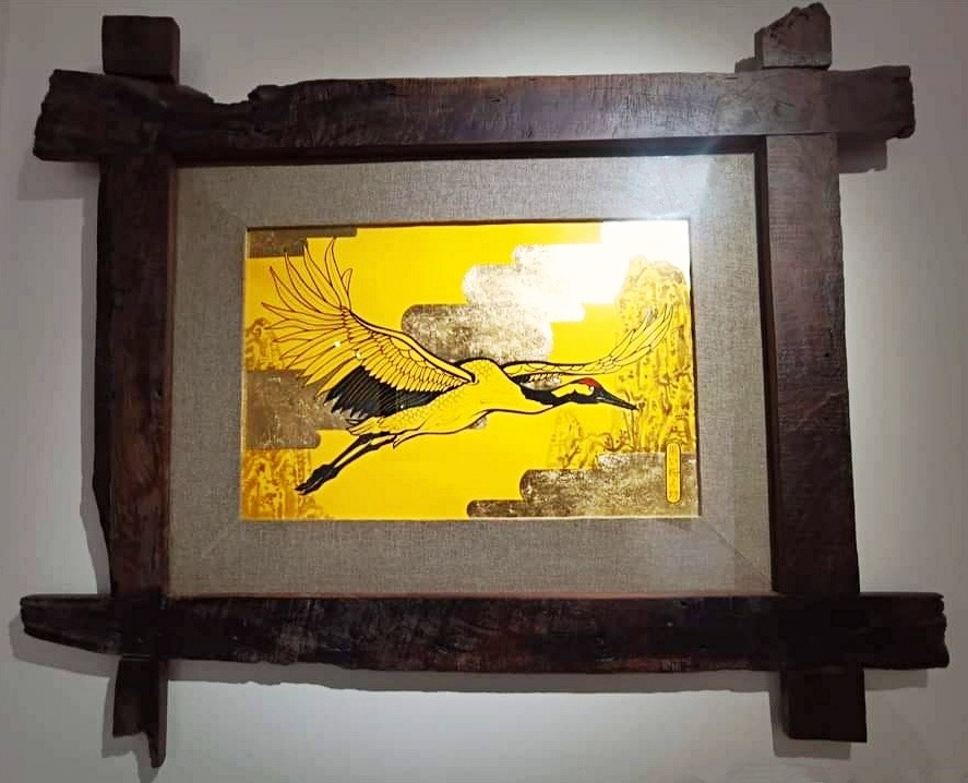Encadrement : Bois rare centenaire de Tamarin des Hauts récupérés dans de vieilles cases créoles, passe en Goni | Encre de Chine, encres à l’eau, feuilles d’or | 60x110cm