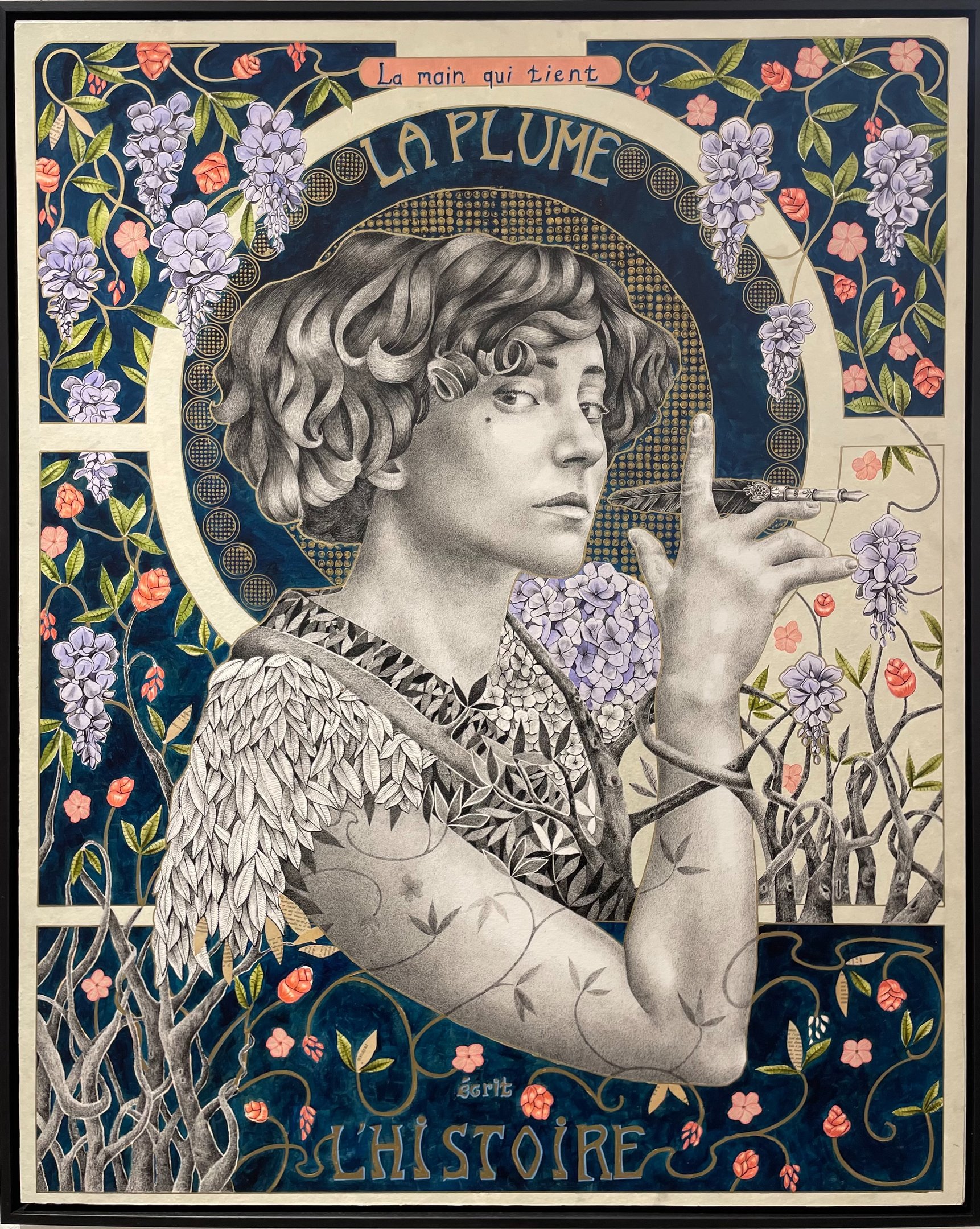 Stylo, pigments, acrylique dorée sur papier aquarelle encollé sur planche de médium Encadrement bois blanc / 70x125cm